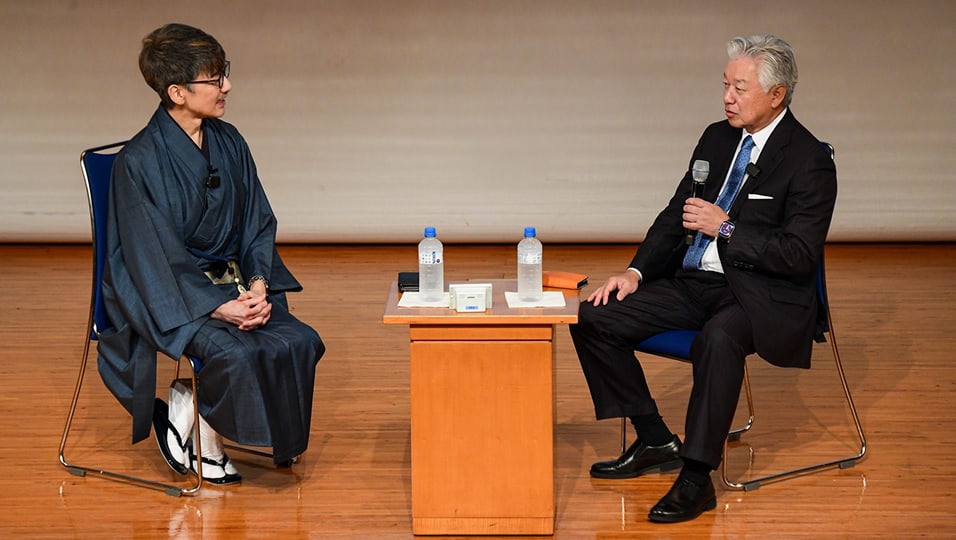 グループ代表・熊谷正寿が、約300名の前で注力するAI・ロボティクスやセキュリティ分野における現在の取り組み、そして手帳を活用した夢の叶え方について、60分にわたり講演。同大学院の特命教授・佐山展生氏を交え、活発な質疑応答も繰り広げられました。